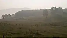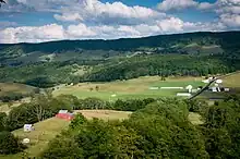 The average elevation of Highland County is 2,832 feet (863 m), which is the 16th highest average elevation among counties in the Eastern United States.[12] The highest elevation in the county is 4,545 feet (1,385 m) in the Allegheny Mountains and the lowest elevation is 1,625 feet (495 m) near the Cowpasture River southwest of Patna.[10][13] The western regions of the county are generally higher in elevation than are the eastern and especially southeastern regions.[14] As the county lies within the Ridge-and-Valley province of the Appalachian Mountains, it features numerous valleys and mountain ridges that are generally oriented in a "northeast to southwest" direction.[13] The valleys are from west to east the Alleghany Valley, the Bluegrass Valley, the Monterey Valley, the Bullpasture Valley, and the Cowpasture Valley.[9][15] The majority of the county and all the southern portions of the county form part of the James River watershed, while northern sections drain into the Potomac River. West of Monterey, the divide is roughly centered along the path of U.S. Route 250; however, in eastern Highland County, the James watershed extends further northward.[13][16]