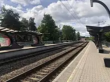 There are two platforms along the two-lane railway, both 146 meters long. Elron's electric trains from Tallinn to Keila, Paldiski, Turba and Klooga-Rand stop at Hiiu station.[1] The station belongs to the Zone I, within which traffic is free for Tallinners.