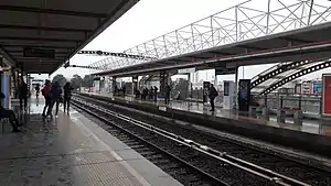 Hilal is an elevated station on the Fahrettin Altay—Evka 3 Line of the İzmir Metro in Konak. Located above the Turkish State Railways' Hilal junction, it is one of the ten original stations of the metro system. Connection to İZBAN commuter trains are available at Hilal railway station.[1] Since Hilal is located in the middle of a railway junction, no direct connections to ESHOT city bus service is available. The closest bus stop is located on 1396th Street about 460 m (1,510 ft) northwest of the station.
