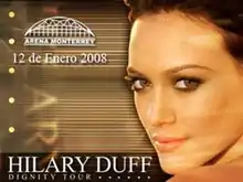 The Dignity Tour is the fourth concert tour by Hilary Duff in support of her fourth studio album Dignity. Tickets for most of the leg sold out prior to the show. The tour began in Los Angeles, California on July 28, 2007, and closed in Melbourne, Australia at Rod Laver Arena on February 3, 2008.
