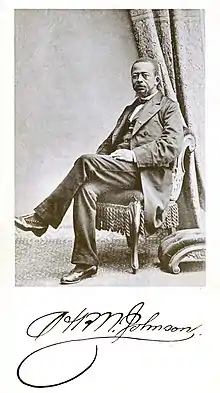 Of Americo-Liberian ancestry, Johnson was born in Monrovia in the colony.[3] His parents were Elijah Johnson,[1] one of the original African-American settlers who founded the colony at Cape Mesurado, and his second wife Rachel Wright (b. 1798), another early settler. Johnson was educated in the colony at Alexander High School and later taught at Liberia College, with his later political adversary, Edward Wilmot Blyden.[4]