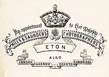 Hills & Saunders was one of the leading Victorian photographic firms, started in 1860 as a partnership between Robert Hills, a hairdresser and wigmaker, and John Henry Saunders (1836–1890).[1] They were social photographers with studios at different times in: London (society), Harrow, Eton, and Rugby, all locations of leading schools, Oxford and Cambridge, and Aldershot & Sandhurst (centres of the British army). They were successful, being appointed as photographers to members of the royal family, including the Prince of Wales and Princess Beatrice, and they were given a Royal Warrant as photographers to Queen Victoria in 1867; many of their photographs are still in the Royal Collection.[2] However, the network of branches did not remain united. The partnership of Robert Hills and John Henry Saunders was dissolved in 1889, although members of both families continued to operate local branches under the same name. Only the two main school branches, at Eton and Harrow, continued well into the 20th Century. Ultimately the Harrow business closed and the photo archive was acquired by the school, but the Eton business survived into the 21st century. In 2019 the historic company was acquired by its Oxfordshire based contemporary, Gillman & Soame, in order to preserve the extensive archives and ensure the future of the prestigious Victorian photographic studio.