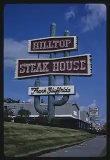 In 1961, Giuffrida, a 43 year old butcher from Lawrence, Massachusetts, purchased a small bar on busy Route 1 in Saugus for $7,000 and converted it into a 125-seat steakhouse. The restaurant soon drew large crowds, which required an expansion to 400 seats. A third expansion later brought the restaurant's capacity up to 1,500 seats. Giuffrida also added a butcher shop to the rear of the restaurant.[1] The Hilltop was known for its decorations outside including a 68-foot-high neon cactus and plastic cows. The Boston Globe’s Anthony Spinazzola described the Hilltop's interior decor as "old ranch modern with wooden Indians, stone fireplaces, buffalo heads, Victorian lighting fixtures, plastic flowers and color that runs to expected browns and reds".[2] The restaurant featured five dining rooms and a cocktail lounge named after Wild West cities (Dodge City, Kansas City, Sioux City, Carson City, Santa Fe, and Virginia City).[3] Until the 1990s the restaurant did not take reservations or accept credit cards.[4]