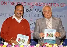 Sarma with Kapil Sibal, releasing a report on Seismic Microzonation of Guwahati, on 18 January 2008