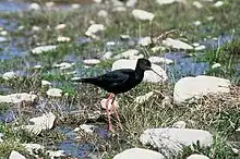 The black stilt (Himantopus novaezelandiae) or kakī (Māori) is a wading bird found in New Zealand. It is one of the world's rarest birds, with 169 adults surviving in the wild as of May 2020. Adult kakī have distinctive black plumage, long pink legs, and a long thin black bill. Black stilts largely breed in the Mackenzie Basin in the South Island, and are threatened by introduced feral cats, ferrets, and hedgehogs as well as habitat degradation from hydroelectric dams, agriculture, and invasive weeds.