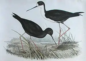 Black stilts are one of several species in the genus Himantopus, classified along with avocets in the family Recurvirostridae. Although genetically and behaviourally distinct from pied stilts (Himantopus himantopus), they are able to successfully hybridise with them. Hybridisation and dilution of the gene pool is one reason black stilts are threatened with extinction.[2] Black and pied stilts in New Zealand represent two colonisations of pied stilt ancestors from Australia: the first, long ago, giving rise to melanistic descendants, the second in the early 19th century.[2]