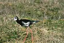 Black stilts are a medium-sized (220 g) wader with extremely long pink legs, red eyes, distinctively black plumage, and a long slender black bill. Juveniles have a white breast, neck and head, with a black patch around the eyes, and black belly feathers that distinguish them from pied stilts.[3] Black adult plumage appears in their first or second year. Black plumage may be an adaptation to "absorb heat better in the cold, windswept habitat of glacial riverbeds and lakeshores".[4]