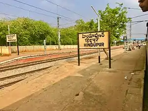 Hindupur railway station (station code:HUP[1]) is a main railway station in Sri Sathya Sai district, Andhra Pradesh. Its code is HUP. It serves Hindupur city. The station consists of four platforms. The platforms are not well sheltered. It lacks many facilities including water and sanitation.[2] The station is administered under Bangalore division of South Western Railway zone.[3][4]