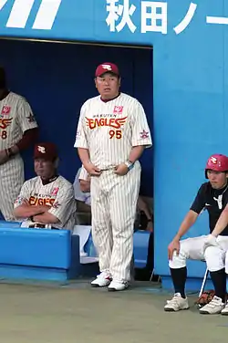 Hiromoto Okubo (大久保 博元, born February 1, 1967), nickname "Dave" is a former Nippon Professional Baseball catcher. After playing, he turned to managing and coaching. In 2015, Hiromoto was promoted from Rakuten's farm team manager to Tohoku Rakuten Golden Eagles full-time manager. He only lasted one season, however, as he resigned after the team again finished in last place.[1]