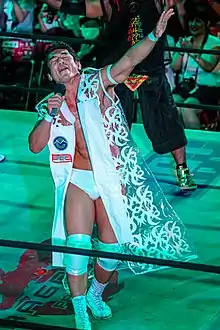 Mihara was originally trained in professional wrestling at the All Japan Pro Wrestling (AJPW) dojo, before going on a learning excursion to Mexico, where he made his in-ring debut on February 22, 2007, in a tag team match, where he, performing under the ring name Yamato, and fellow All Japan debutant Kai faced Los Traumas (Trauma I and Trauma II).[2] Mihara spent the rest of 2007 in Mexico, losing his hair to Cerebro Negro in a Lucha de Apuestas on June 21 and winning the 2007 Rey del Ring on July 26.[2][8][10] Mihara finally returned to Japan and All Japan Pro Wrestling in February 2008, adopting the ring name Hiroshi Yamato and forming a regular partnership with Kai, which eventually led to the two coming together with Satoshi Kojima and Zodiac to form the stable F4 (Friend, Fight, Fan and Future).[2][3] Through the new alliance, Yamato also made his debut for New Japan Pro-Wrestling on October 13, 2008, at Destruction '08, in a six-man tag team match, where he, Kai and Kojima were defeated by Great Bash Heel (Togi Makabe, Tomohiro Ishii and Toru Yano).[11] On December 14, Yamato, Kai and Kojima faced each other in a special three-way elimination match, where Yamato was victorious, scoring pinfalls over both of his opponents.[12] Yamato continued teaming with Kai throughout 2009, with the two entering the 2009 Junior Tag League in April, from which they were eliminated after losing to the team of Petey Williams and Phil Atlas in their final round-robin match.[13] On January 3, 2010, Yamato won the annual junior heavyweight battle royal in Korakuen Hall.[14] As a result, he was granted his first shot at the World Junior Heavyweight Championship, but was defeated in the title match on January 11 by the defending champion, Kaz Hayashi.[15] F4's long storyline rivalry with the Voodoo Murders stable built to a four-on-four match on February 7, 2010, where F4 was defeated and, as a result, forced to disband.[2][16]