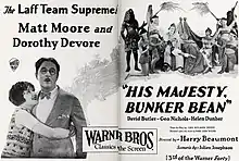 His Majesty, Bunker Bean is a 1925 American silent comedy film directed by Harry Beaumont and starring Matt Moore. It is based on a 1916 play, His Majesty, Bunker Bean by Lee Wilson Dodd, taken from a novel Bunker Bean by Harry Leon Wilson. It was produced and distributed by Warner Bros.[2][3]