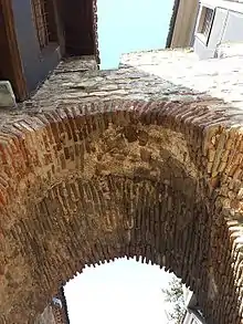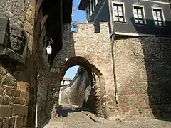 Hisar Kapia (from Turkish: Hisar Kapı meaning "Castle Gate") is a medieval gate in Plovdiv's old town and one of the most famous tourist sights in the city. The gate was built in the 11th century AD over the foundations of a gate from Roman times (probably from the 2nd century AD). Hisar Kapia is one of the three entrances (Eastern, Northern and Southern) to the acropolis of ancient Plovdiv. During the rule of the Ottoman empire revival houses were embedded in the remains of the old stone walls around the gate.[1]