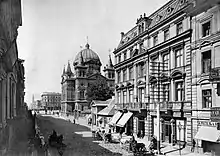 In 1899, brothers Władysław and Antoni Krzemiński from the Polish noble family of Krzemiński of Prus III coat of arms founded the first stationary scinema in Poland (Gabinet Iluzji) at Piotrkowska Street.[10] In 1899 Józef Piłsudski, the future Polish leader during World War I and the interwar period, and his wife Maria Piłsudska settled in Łódź.[11] They edited and printed underground Polish press in the city, for which they were arrested by the Okhrana in 1900, and then imprisoned in the Warsaw Citadel.[11]