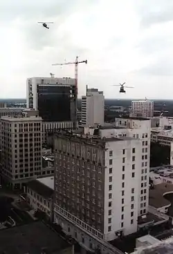U.S. Marines train by air in a downtown drill. In the foreground is the former Hotel Roosevelt.