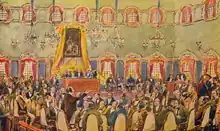 On 12 October 1897, King D. Carlos arrived in Lagos by boat, accompanied by his wife Amélia de Orleães.[106] The ceremony began with the arrival of the escaleres bringing the royal couple and the other guests, which passed through the middle of two wings formed by hundreds of boats decorated for the purpose, and where a large crowd of people launched firecrackers and greeted the kings.[106] The city of Lagos was also decorated for this visit, with ornaments in every street from Constituição Square to Porta de Portugal Street, while quilts hung from the windows.[106] The royal couple disembarked at Constituição Square and proceeded to the Santa Maria Church, then proceeded to the Paços do Concelho, where a speech was heard by the mayor and a meal was taken.[127] During the ceremony, the royal couple laid the first stone for the construction of the wall, although the work never got underway.[128] In 1902, the government ordered repairs to be made to the walls between Ribeira and Porta de Portugal, after many complaints by the municipality.[129]
