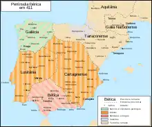 The Roman domination of the Iberian Peninsula entered into decay in the 5th century, with the invasions of the Alans, Vandals and Suebi, who had made an agreement in 409 with Magnus Maximus, pretender of the imperial title, and in 411 they divide the peninsula among themselves with the agreement of the emperor Flavius Honorius, leaving Lusitania to the Alans.[25] However, in 415 the Romans were forced to ask the Visigoths for help, due to the plundering by the Alans and Silingi Vandals.[25] The Visigoths thus invade the peninsula, which they came to dominate completely after the fall of the last colonies of Byzantium in 624.[26] In 622, Lagos was already a seat of a bishopric, since in that year its bishop attended a Toletan Council.[27] Silva Lopes, quoting the historian Faria e Sousa, confirmed the presence of a bishop based in Lagos, and who had the name of Servo, while Father João Baptista Coelho stated that the bishop of Lagos, called Servo de Deus, had attended one of the councils of Toledo during Sisebert's term as archbishop of Toledo.[27] Antonio Caetano da Costa Inglez, prior of the church of Santa Maria de Lagos, mentioned that according to several ancient authors, including the Spanish historian Ambrosio de Morales, the bishop of Lacobriga had been in the fourth, sixth and seventh councils of Toledo.[27]