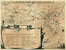 - ↑ At the time, Cape Branco beach stretched along the entire coastline from present-day Cape Branco to Cabedelo. The Dutch landed in what is now the municipality of Cabedelo.
