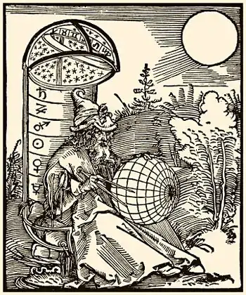 An engraving by Albrecht Dürer featuring Mashallah, from the title page of the De scientia motus orbis (Latin version with engraving, 1504). As in many medieval illustrations, the compass here is an icon of religion as well as science, in reference to God as the architect of creation