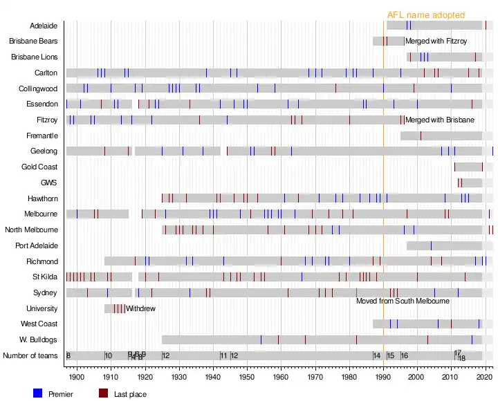 The Victorian Football League was established in 1896 when six of the strongest clubs in Victoria—Collingwood, Essendon, Fitzroy, Geelong, Melbourne, and Sydney Swans—broke away from the established Victorian Football Association to establish the new league.[1] The six clubs invited two more VFA clubs—Carlton and St Kilda—to join the league for its inaugural season in 1897. Among the notable initiatives established in the new league was an annual finals tournament rather than awarding the premiership directly to the team with the best record in the season; additionally, the formal establishment of the modern scoring system was set in which six points are scored for a goal, and one point scored for a behind.