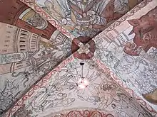 Inside, the vaults of the choir and apse are decorated with murals made in the early 16th century and probably no later than 1510. Stylistically these differ from any other medieval murals in the province. They depict similarities to decorations in the church of Mary Magdalene in Djursland, Jutland, as well as those in Nørre Herlev, Zealand and may have been made by either one of the artists decorating these churches. The subjects depicted are visions of Heaven and Hell, including the Last Judgment, and the Trinity with Mary. The depictions show a throng of people and beasts in the narrow space of the vaults.[1][3]