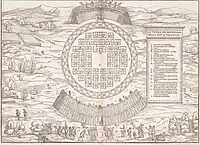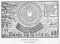 The original documentation that describes the village’s location is Bref récit et succincte narration de le navigation faite en MDXXXV et MDXXXVI, which Cartier gave to King Francis I of France in 1545. A plan exists titled La Terra de Hochelaga nella Nova Francia, which illustrates, in the European manner of the period, Cartier's original visit. Giacomo Gastaldi illustrated Hochelaga in the third volume of Delle navigationi et viaggi, a work done in Venice between 1550 and 1556 by Giovanni Battista Ramusio. The perfect, regular arrangement of the houses, conforming to the urban ideal of the Italian Renaissance, as well as the boards covering the village's palisade, were probably his own fabrications. If the plan faithfully illustrates the notes of the French explorer, it offers little resemblance to ethnohistorical reality.[8] A reproduction of La Terra de Hochelaga by Paul-Émile Borduas decorates the walls of the Grand Chalet of Mount Royal Park.