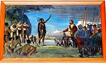 Painting by Adrien Hébert representing Jacques Cartier meeting the Iroquois. The Iroquois chief raises his arm as a sign of welcome, while Cartier responds by raising his own slightly while keeping the other hand on his sword.