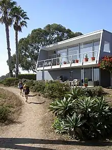 The first house, The Sunset House, built in 1957, was demolished in 2013, while the second house, the Hodgkins and Skubic House, built in 1967, is still standing. The houses, with a third one built next door, were featured in the book Santa Barbara Architecture, from Spanish Colonial to Modern which was published in 1975; of the surviving house, the book says: "A simple and effective statement using common materials of redwood, block, and glass in its construction."[1]