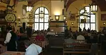 Munich's largest tourist attraction after the Oktoberfest, the Hofbräuhaus am Platzl is also frequented by locals, many of whom keep their personal mugs ("Krüge") stored there.[4] During regular hours traditional Bavarian music is played. The famous Hofbräuhaus song (Hofbräuhaus-Lied), composed in 1935 by Wilhelm "Wiga" Gabriel, goes: "In München steht ein Hofbräuhaus, eine, zwei, g'suffa!" ("There's a Hofbräuhaus in Munich—one, two, down the hatch!" in the local dialect).[5]