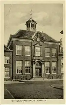 It was built from July 29, 1730, to 1733 from the legacy of the Haarlem thread-seller Ysbrand Staats. He left his entire legacy to the poor, and his brother took charge of building this hofje after he died. The first hofje to be built in the 18th century, the executors visited Alkmaar under the leadership of architect Abraham Kleijn, to visit the "new style hofje" Wildemans. In former times hofjes were built in the back gardens of larger homes of the wealthy donors. In 1730 the new style hofjes were luxurious complexes with fancy gateway buildings directly on the street. The original gateway house of this hofje still stands, but no longer functions as the home of a governing regent, but as a storefront. It is certainly grander than the Wildeman's hofje, but was itself surpassed as the fanciest hofje in Haarlem by the Teylers Hofje.