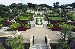 It is divided into 16 themed sections or "rooms" with plantings being rotated throughout the year. Not all of the rooms feature heavy planting, for example the Gazebo and Trellis area displays Tuscan style, neoclassical architectural design elements. Some of these rooms showcase water features such as the Grotto, a shady section of garden that houses tropical ferns and orchids; the Rosette Plaza and Fountain, a grand, central, open-spaced display; Bowls and Runnels, a long gravity-fed fountain that takes water from the Rosette Fountain down to Lake Mirror; and the Lily Pond, a small secluded koi pond surrounded by rustling bamboo. There are rooms named after their colors including the Red, Yellow, and White Rooms. Other rooms are named after their planting types like the Vegetable Room, Tropical Room, and Herb Rooms, and Patterned Flowerbeds. Two of the rooms, Sustenance Orchard and Trees of Americana, showcase the botanical heritage of Florida and the United States. The trees in the Trees of Americana Room are all relatives of famous trees of American history including a Water Oak from Helen Keller's home, a Sycamore from Susan B. Anthony's grave,[3] an Oak from 16th U.S. President Abraham Lincoln's birthplace, a Weeping Willow from the musician Elvis Presley's front yard, and, previously, a tree associated with the poet Edgar Allan Poe, which died.[4] Lastly, the Butterfly Garden is designed and dedicated to the local pollinators such as butterflies, moths, and bees. The rooms and areas are connected by labyrinthine walkways that connect the garden to the surrounding Lake Mirror complex.[1] The staff maintain a growing collection of plants from around the world including several incense plants like the Frankincense Tree and the Balm of Gilead, and edible plants like the Blackberry Jam Fruit and the Peanut Butter Fruit.[3]