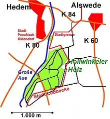 Location of Hollwinkel Wood. The wood itself is bounded by the town limits (Stadtgrenze) and the Große Aue river.