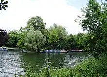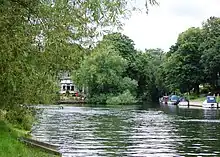 The island is situated in a small channel between the larger Holm Island and the north bank of the Thames. It is located in Berkshire, in the Royal Borough of Windsor and Maidenhead, near the county boundary with Surrey.[1][2] Until county boundary changes in 1974, the island was within the county of Buckinghamshire[3] and near the border with Middlesex.[4] The island is approximately 80 miles (130 km) from the Thames Estuary at the Isle of Grain.[5]