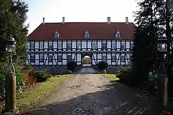 Golmegaard's half-timbered main building stands on an almost quadratic castle bak surrounded by moats. It consists of a 26-bays long, two-storey main wing in the west and two slightly lower side wings in the south and north. The hipped roof is clad in red tile. It is pierced by a number of tall, white-plastered chimneys. The gate in the main wing features the coat of arms of the Daa family and the inscription ”Her Claus Daa til Rafnstrop med sin kære frue Ingeborg Parsberg lod dette hus opsætte, der man skrev efter guds byrd anno 1635”. The two side wings were priginally single-storey, free-standing buildings. The south wing was heightened and attached to the main wing in the late 17th century. A stone tablet with the year "1675" and the coat of arms and initials of Otto Krabbe and his first wife Dorthe Gersdorf seems to date this extension to that year. The north wing is 21 bays long of which the first nine-bays-long section is two storeys tall and the remaining 12 bays are single-storey. The single-storey section was originally used as a smithy but has now been converted into a garage. The south wing was formerly also 21 bays long, but its eastern part collapsed in the late 18th century and was never reconstructed.[4]