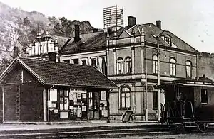 The town's first station opened in 1881 and serving the Vestfold Line, was operated by the Norwegian State Railways (NSB). With the planning of a private railway to Hvittingfoss during the last years of the 1890s, there arose a controversy over the location of a new station in Holmestrand. As both single parcels and whole wagon-loads would be transshipped between HVB and NSB, the two railway lines would necessarily have to be connected. Five proposals for lines were made, which would either give a common station for both railways in Holmestrand, or two separate stations. Two of the alternatives called for a common station, with the tracks either running via Gausen or the docks. A separate station was proposed either at the town square, with the connection line being built via Gausen or the docks. Alternatively, the station could be built at Gausen.[1]