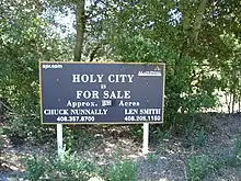 1. 1 2 "Ghost town symbolizes woes of real estate icon. Commentary: Grubb & Ellis is becoming a ghost town itself". February 24, 2012. Retrieved February 27, 2012. The abandoned, 142-acre property between Santa Cruz and San Francisco is a rare swath of available land, complete with its own zip code, 95026. "It's a great property, only five miles away from civilization," said Dave Haugh, a Grubb & Ellis senior vice president in San Jose, in a brief phone conversation ... On the plus side, it features majestic redwood trees and a creek with waterfalls. On the minus side, it has no sewer system, some dilapidated buildings and a creepy history ... Developers who bought Holy City in 1968 evicted squatting hippies, thought of turning what was left into some kind of campground, and ultimately accomplished nothing. Now they're in their 80s and want to sell.