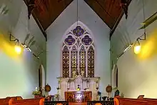 The church was designed by Major Thomas Skinner, an engineer who worked in the Public Works Department, in a Victorian Gothic style.[4][5] The dominant feature is the landmark 37 m (120 ft) bell tower at the entrance of the church. The church is 32 m (105 ft) in length, with the roof of the nave resting on six arches. The stained glass windows were imported from England. The pipe organ was donated in 1902 by the Mendis brothers.[2]