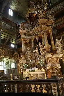 The Holy Trinity Church of Peace in Świdnica is the largest wooden Baroque temple in Europe[1] and a historic religious building built under the agreements of the Treaty of Westphalia signed in 1648, which ended the Thirty Years' War.[2] It belongs to the Świdnica parish of the Evangelical-Augsburg Church in Poland. The building has been on the UNESCO World Heritage List since 2001.[3]