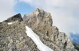 Holzgauer Wetterspitze is a mountain in the Lechtal Alps of Tyrol, Austria. The elevation at its peak is 2,895 metres (9,498 ft). It is located in the district of Reutte, 7 kilometres (4.3 mi) south of Holzgau, for which its name (meaning "Holzgau weather tip/point") is derived, and 5 kilometres (3.1 mi) east of Kaisers. It is also about 600 metres (2,000 ft) north of the Feuerspitze (2,852 m).