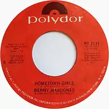 "Hometown Girls" is a song by American singer-songwriter Benny Mardones, which was released in 1980 as the second and final single from his second studio album Never Run, Never Hide. The song was written by Mardones and David Leigh Byron, and produced by Barry Mraz. As the follow-up to Mardones' US top 20 hit "Into the Night", "Hometown Girls" failed to enter the Billboard Hot 100 but reached No. 3 on the Bubbling Under the Hot 100 chart.[1]