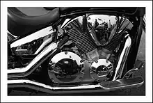 Although it was similar to the 1800, the 1300 was not the same engine with a smaller bore or shorter stroke, but a new design.[21] The 1300 engine used a 38 mm constant velocity carburetor unlike the fuel injected 1800. The single carb had a manual choke for cold starts,[22] and was heated by engine coolant to improve cold-weather operation. The configuration of the new powerplant was the same liquid-cooled overhead-cam 52-degree V-twin layout as its larger sibling, but the VTX1300 engine was designed around a single-pin crankshaft, unlike the 1800s dual-pin crank. As a result, the 1300 required dual two-axis primary counterbalancers to control engine vibration. The VTX1300 engine had a cable-operated clutch, instead of the hydraulic clutch of the VTX1800.[7] The 1300 engine used an air injection system and catalytic converters, similar to the bigger engine, as well as a lean fuel-air mixture to control emissions.[24]