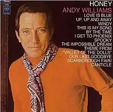 Honey is the twenty-second studio album by American pop singer Andy Williams, released in the spring of 1968 by Columbia Records.[1] In reviewing the LP William Ruhlmann of Allmusic traced the progression of the Williams formula, noting that "he had been drawing on the recent hit parade for some of his material for years. But Honey marked his complete crossover to such an approach. Where earlier Williams albums had been a canny mix of movie songs, standards, pop hits, and foreign -- especially French -- material, ten of Honey's 11 tracks were songs that had been Top 40 hits in the last two years."[1]