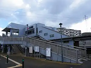 The station consists of an island platform serving two tracks. The station building is a hashigami structure where the passenger facilities (a waiting room, automatic ticket vending machines and ticket gates) are located on the second level on a bridge which links to the platform. The bridge also serves as a pedestrian crossing, linking the streets on both sides of the tracks. Access to the second level of the hashigami structure is by flights of steps or elevators. A bike shed is provided outside the station.[2][3][4]