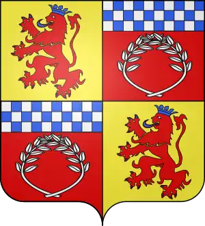 Field : quarterly 1st and 4th Or, lion rampant displayed Gules, armed, langued and crowned Azure (d'Albert) ; 2nd and 3rd Gules, two branches of the wild service tree Argent, in double saltire, chief chequy Gules and Argent (d'Ailly).[2][3]