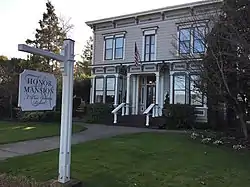 The historic mansion was built in 1883 by William "Squire" Butcher in the Victorian Italianate style.[1] Butcher was wealthy, having made money during the California Gold Rush. He discovered gold after his wagon full of potbelly stoves collapsed due to the weight. The collapse exposed a vein of gold underneath the wagon. At the time he built the mansion, he was a cattle rancher. He started raising cattle after he discovered gold and bought a property in Vacaville, California, to start his new business. Eventually, Butcher, his wife, and four daughters relocated to Healdsburg, near the Pacific Union College, where his children would attend college. Upon relocating to Healdsburg, he built the mansion that would eventually be called the Honor Mansion.[2]