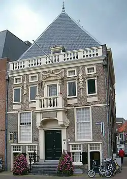 This text in old Dutch says that whenever the Count "planted his court here on the sand" (meaning when he stayed in the large "Gravenzaal" or Count's hall across the square), this honorable building was put to use as the courthouse. The humanist Dirck Volckertszoon Coornhert once ran a printshop from the basement in the 16th century. The baroque facade is newer and dates from circa 1650.