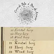 Hooiberg in Spanish and w/ different spelling in Dutch. 1. Cerro de Paja ò Pan de Azucar (1794) 2. Hooy berg (1825) 3. Hooij-berg (1825).