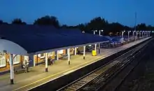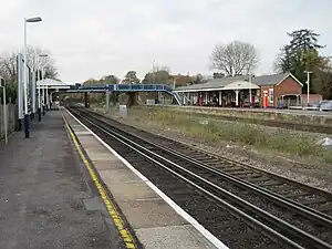Hook railway station serves the large village of Hook and surrounding villages in Hampshire, southern England. There are two platforms serving the outer pair of tracks while the centre pair of tracks have no platforms and are used by through-services.