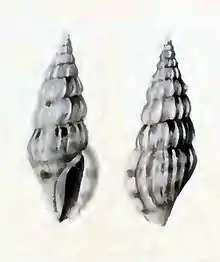 (Original description) The shell is shortly fusiform, rather smooth, light buff, with a few red-brown spots below the suture of lower whorls and one faint band on those whorls and 3 on the body whorl, the siphonal canal being tinted with the same colour. The shell contains 9 whorls, of which 2 upper ones form a smooth, convexly-whorled nucleus. The subsequent whorls are convex, 4 or 5 post-nuclear ones slightly angular below, lower ones becoming more regularly convex. The sculpture consists of numerous, rather narrow, axial ribs, about 20 stronger and weaker ones on the body whorl, that behind the peristome very strong and varix-like; these ribs run from one suture to the other on upper whorls, but are faint towards the base of body whorl, and disappear on the siphonal canal, which is spirally lirate. The upper part of the whorls is very faintly spirally striated. The aperture is ovate, with an angle above, but scarcely with a sinus. The peristome is thin, slightly curved. The columellar margin is tubercled above, then regularly concave and conspicuously enamelled. The aperture ends in a short, wide siphonal canal. The interior of the aperture shows a white layer of enamel near peristome and 3 brown blotches at its margin, corresponding to the external bands.[2]