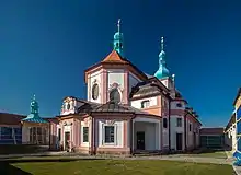 The first written mention of a church in Horní Police is from 1291, but it was destroyed during the Hussite Wars. A new small church became a well-known pilgrimage destination and had to be expanded. The current baroque Church of the Visitation of the Virgin Mary was built by Giulio Broggio on the site of the older church in 1688–1701.[5]