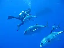 The fish is generally wary of scuba divers; it will move slowly away as divers approach. However, schools have been known to crowd around divers, apparently attracted to the bubbles the diver exhales.